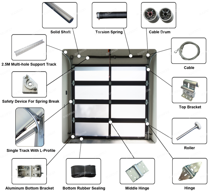 Premium glass garage door hardware collection: extensive variety, heavy-duty materials, customizable spray-painted finishes.